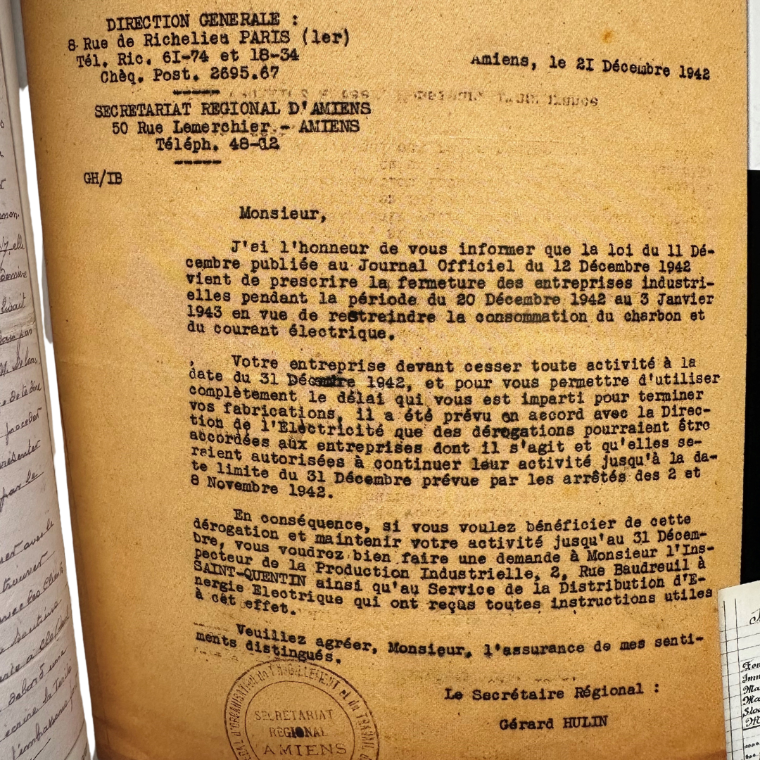 Une activité déserte (1940) : Défaut de la matière première, véhicules réquisitionnés, clients qui se font rares, pénurie économique, arrêt de l’activité… La ville d’Amiens devient déserte ! L’entreprise n’alimente plus la production.